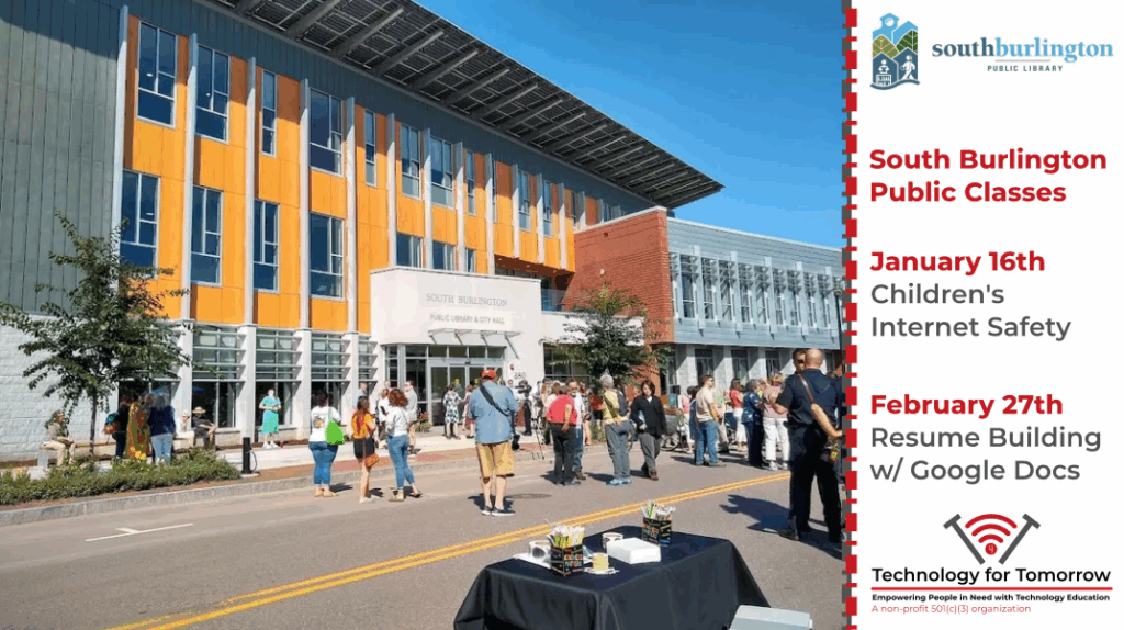 Starting early 2026, Technology for Tomorrow will be partnering with South Burlington Public Library to provide two free public classes! Both classes will be held in the Digital Lab at the South Burlington Public Library from 1pm to 2:30pm.
